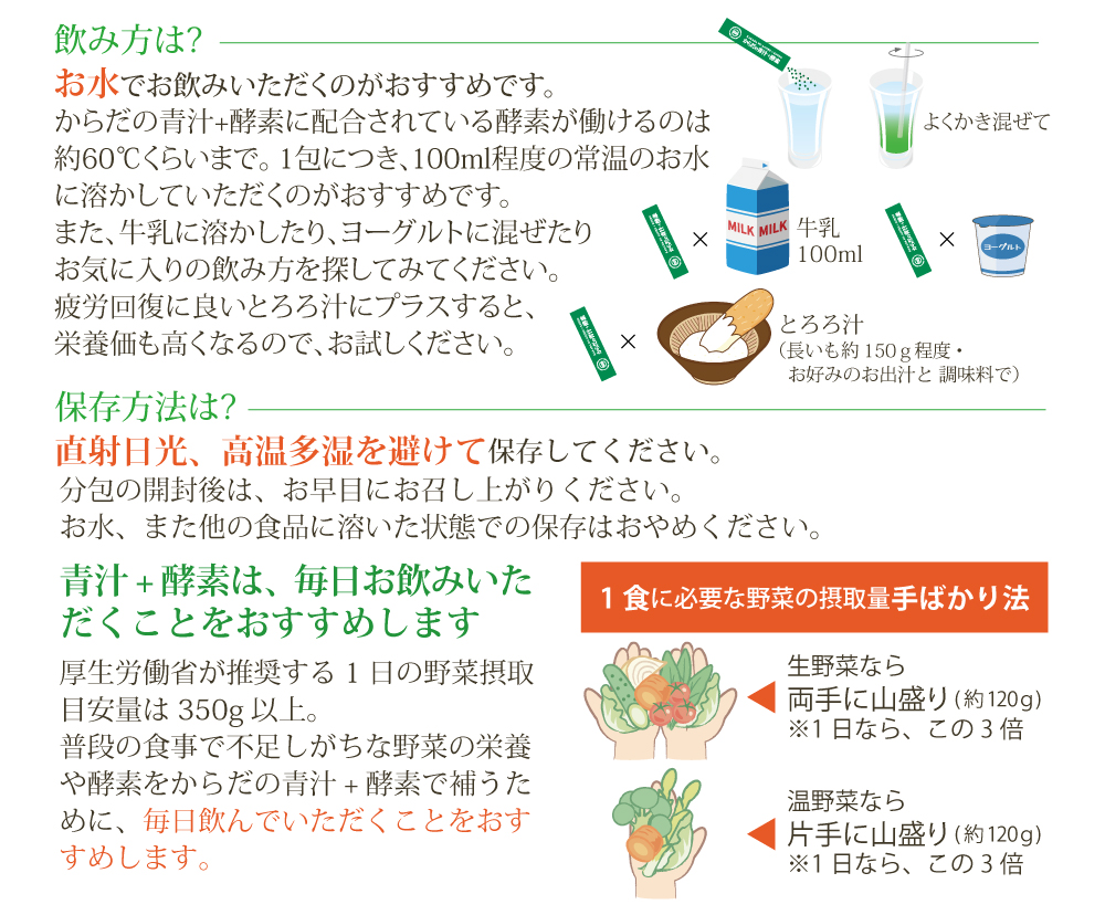 継続はチカラ!! からだの青汁+酵素は、毎日お飲みいただくことが大切です。