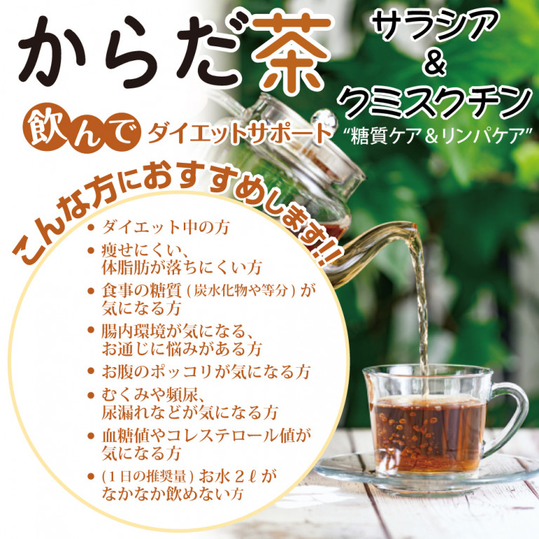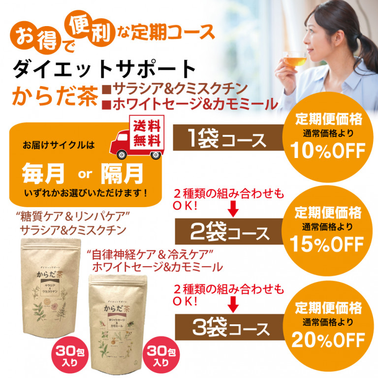 2袋コース以上は、[からだ茶サラシア&クミスクチン]・[からだ茶ホワイトセージ&カモミール]の組み合わせもOK!