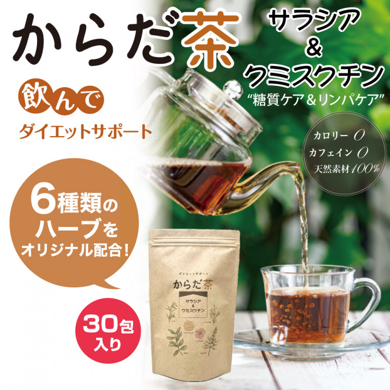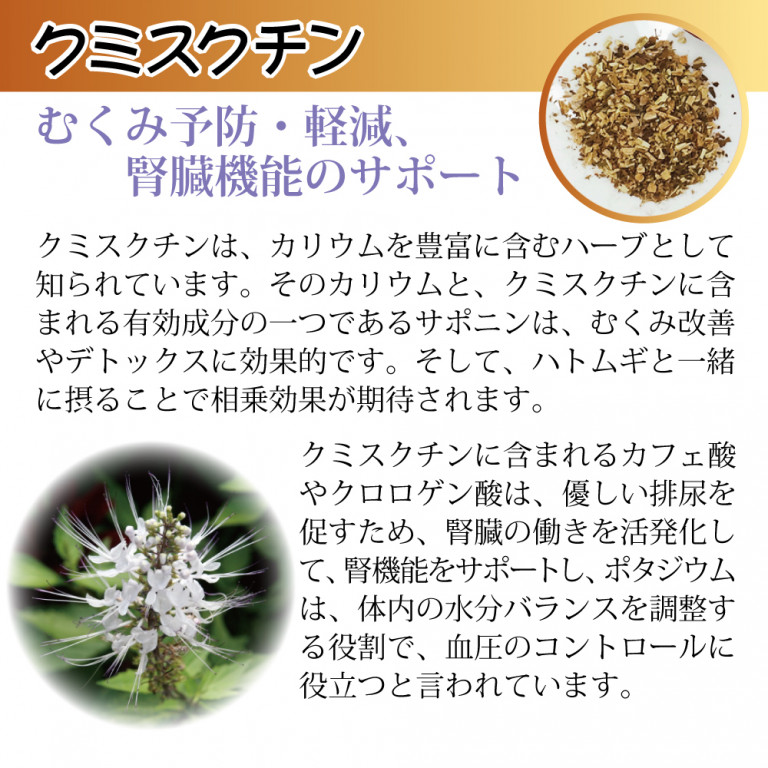 糖の吸収をケアするサラシア、むくみ改善の期待できるクミスクチンなど、6種の100%天然素材ハーブを配合しました。