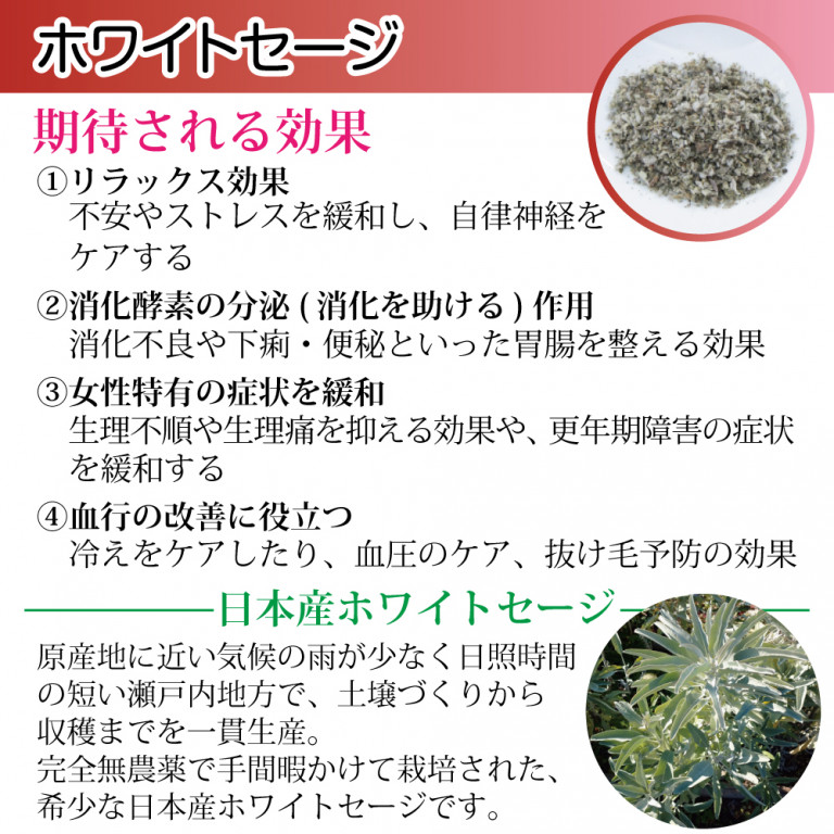 完全無農薬で手間暇かけて栽培された、希少な日本産ホワイトセージなど、8種のハーブを配合。
