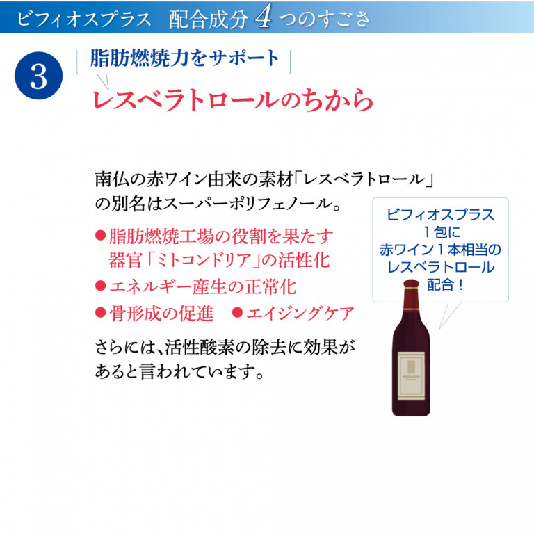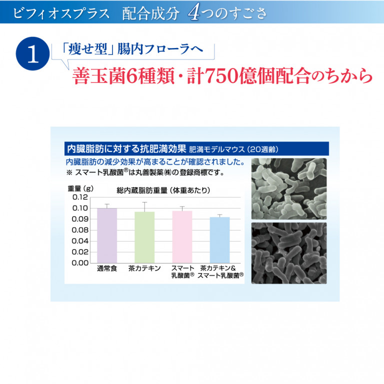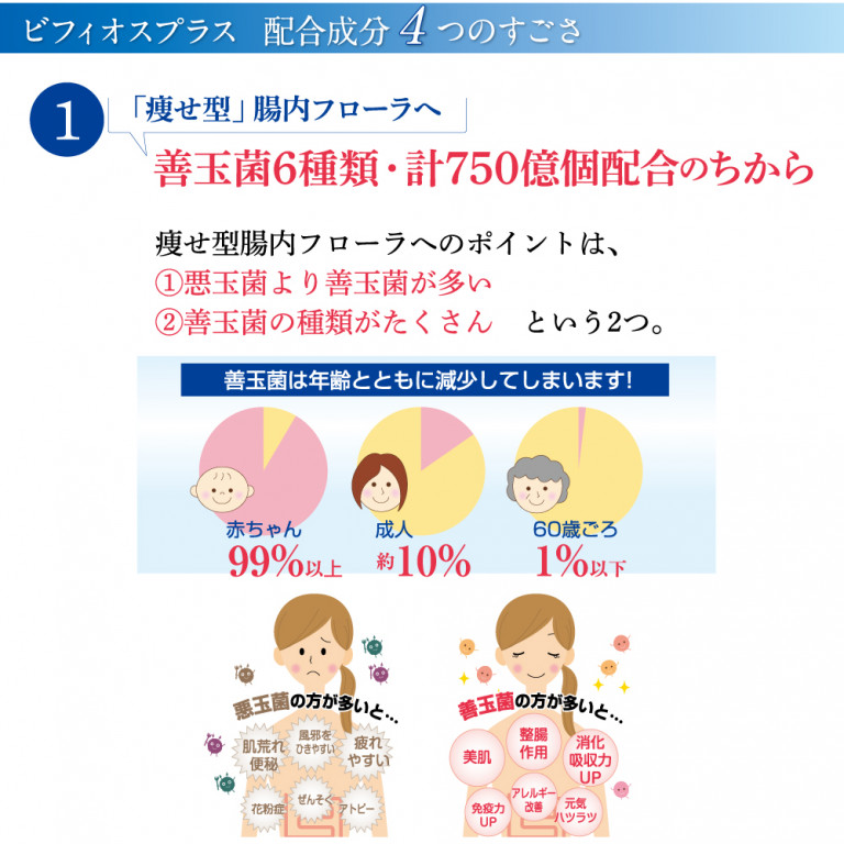 ビフィオスプラスは、乳酸菌やビフィズス菌などの善玉菌を6種類・計750億個配合。