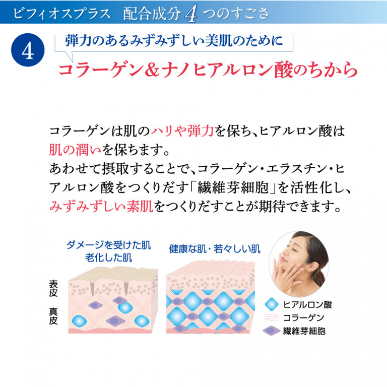 脂質代謝をサポートするダイエットビフィズス菌と、脂質の吸収を抑える茶カテキンが働き、善玉菌優勢の「痩せ型」腸内フローラへとサポートします。さらに、コラーゲン&ナノヒアルロン酸も配合で、美肌づくりも。