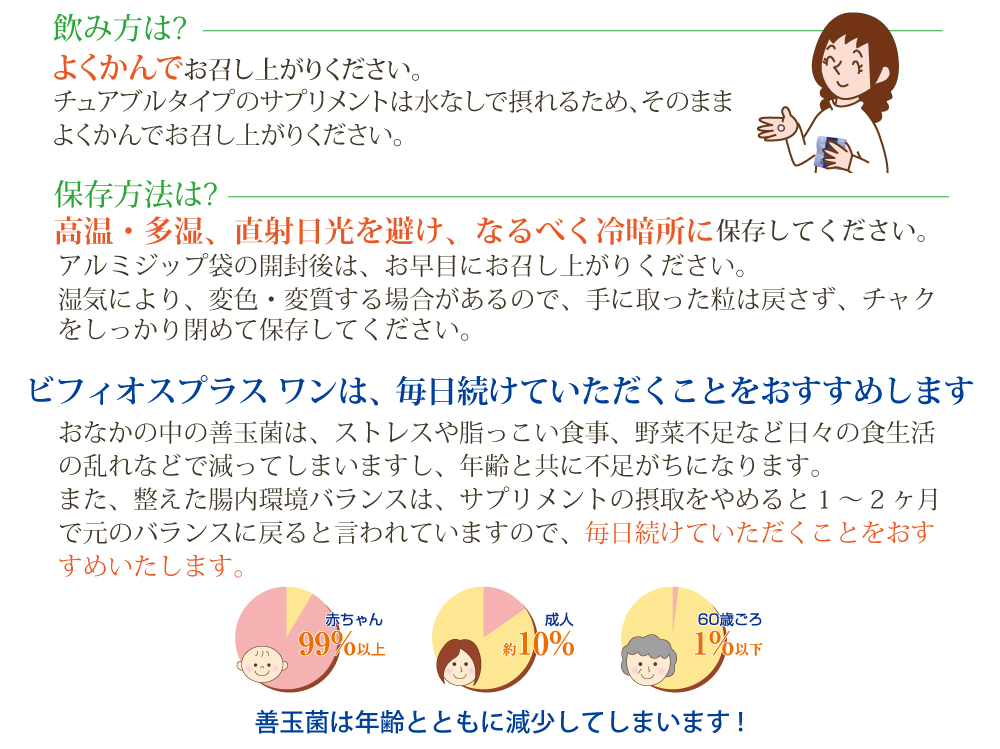 ビフィオスプラスワンは、6種類・計750億個の善玉菌(1箱当たり)を独自配合でブレンドしました。